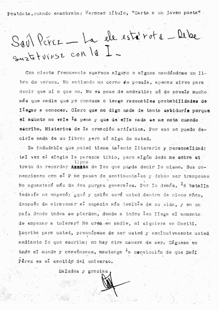 Agradezco la remisión de “Homo-Ciudad”, y digo que me agrada que los jóvenes sean rebeldes. No sé por qué, pero creo que así debe empezarse. Después el tiempo decanta; todo se asienta, y se es o se puede ser definitivamente un revolucionario. No me refiero sólo a lo social, sino también a la actitud que permite que la vida se renueve diariamente, y que nos permite renovarla.